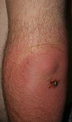 The back story. I got a small rug burn on my left elbow around Nov 11 noticed it and more or less forgot about it. Elbows get more wear and tear then you think and it never really healed I would see dots on the sheets in the morning and sometimes it would stick to my shirt if it was long sleeves. Once again never thought much about it, oh it will heal. Monday Nov 14 went riding ATV's in the woods getting into all sorts of mud and water along with being sweaty. Went home showered. Felt a tickle in the back of my throat Weds or Thurs and thought crap getting sore throat. Felt like crap Thursday, Friday just wiped out no energy decreasing appetite. Saturday more of the same chills and fever set it over night. Went to concert that I did not want to miss. Sunday worse fever chills no energy and trouble sleeping. Elbow becoming uncomfortable and swelling sore to the touch red and angry looking. Monday more of everything and worse I could not even drive .